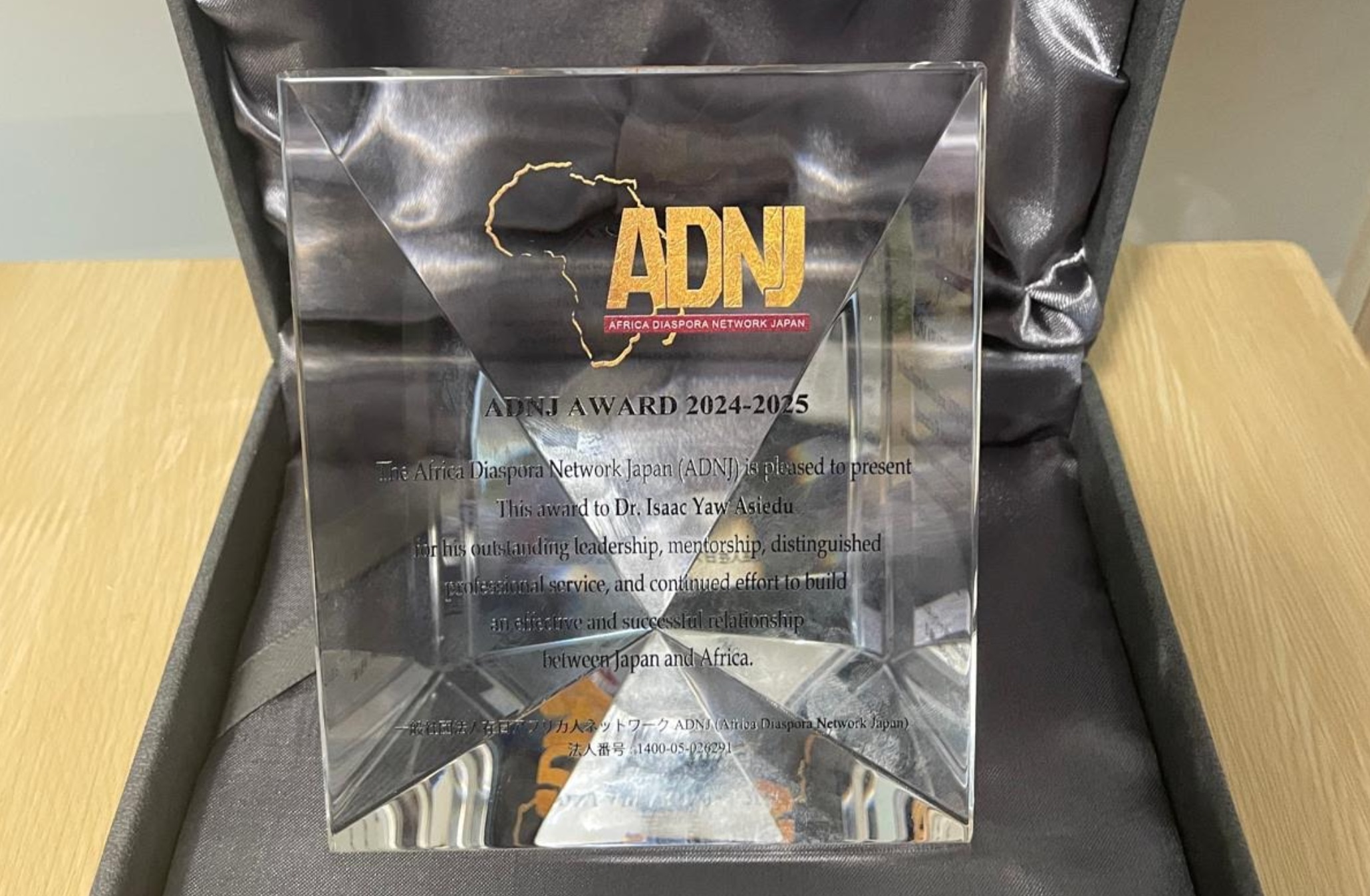 A recognition of AFAM President, Dr. Isaac Yaw Asiedu’s outstanding leadership, mentorship, distinguished professional service, and continued efforts to strengthen the relationship between Japan and Africa.